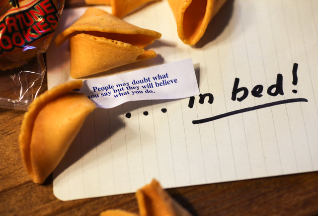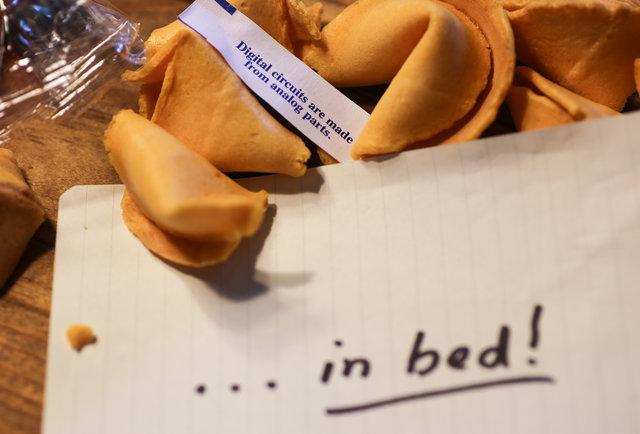 Part of the story was about fortune cookies and mentioned the old joke about adding the words in bed to your fortune. The program should display one of five unique fortunes, at random, each time it's run. my approach was to assign five distinct variables their own individual fortunes: Whenever you get a fortune cookie, you read the fortune and add in bed to the end, will work for every single one out there. My friends and i love playing the fortune cookie game.once, i got a fortune that said 'don't panic.in bed.' by love me i'm a liberal march 17, 2007. Click on the cookie to find out your fortune.